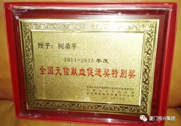 6月10日,廈門市中心血站代表國家衛(wèi)計(jì)委,向柯希平董事長(zhǎng)頒發(fā)“2014-2015年度全國無償獻(xiàn)血促進(jìn)獎(jiǎng)特別獎(jiǎng)”。據(jù)悉,全省僅1人獲此殊榮。“無償獻(xiàn)血促進(jìn)獎(jiǎng)”由國家衛(wèi)計(jì)委組織,每?jī)赡暝u(píng)選一次,授予長(zhǎng)年為普及無償獻(xiàn)血知識(shí),弘揚(yáng)無償獻(xiàn)血人道主義精神,營造無償獻(xiàn)血良好社會(huì)氛圍,推動(dòng)我國無償獻(xiàn)血事業(yè)作出突出貢獻(xiàn)的單位和個(gè)人,是無償獻(xiàn)血事業(yè)的國家級(jí)榮譽(yù)。